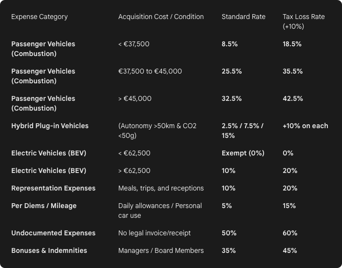 Common expenses subject to autonomous taxation include company vehicles, per diems, representation expenses, undocumented costs, bonuses, and indemnities. The applicable rates depend on the type of expense, the company’s profit status and other compliance factors. Rates may be significantly higher when a company reports tax losses.
